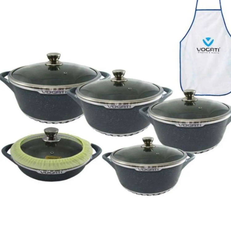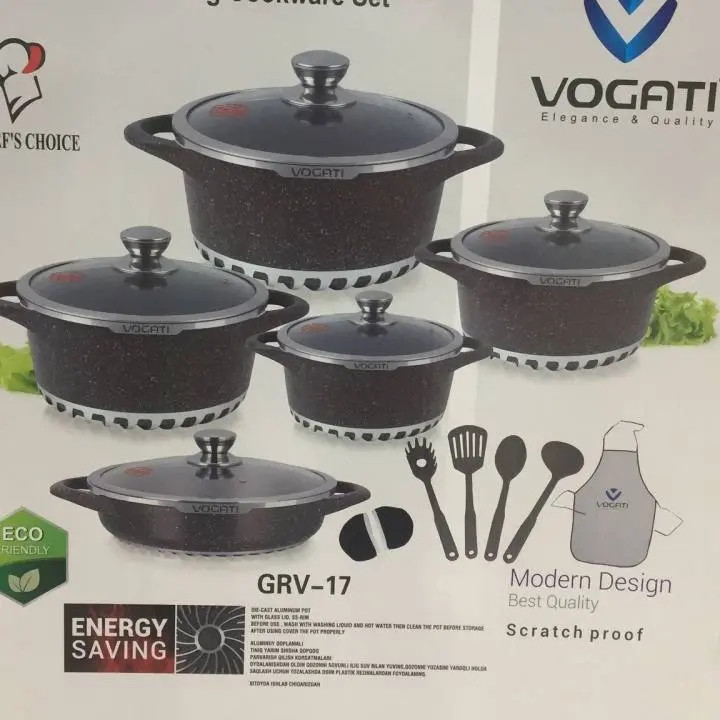سرویس قابلمه وگاتی برند ایتالیایی 17پارچ از جنس آلومینیوم و روکش تیتانیوم و گرانیت می باشد که باعث می شود این محصول کاملا ضدخش و نچسب شود.همچنین غذای کاملا سالم را برای شما طبخ کند. کف خورشیدی این محصول به پخش و جذب گرما کمک می کند. این سرویس شامل ۴قابلمه در سایزهای 20,24,28,32 ویک تابه سایز 28 ۴عدد کفگیر و ملاقه ۲عدد دستگیره ۱عدد پیش بند برند وگاتی